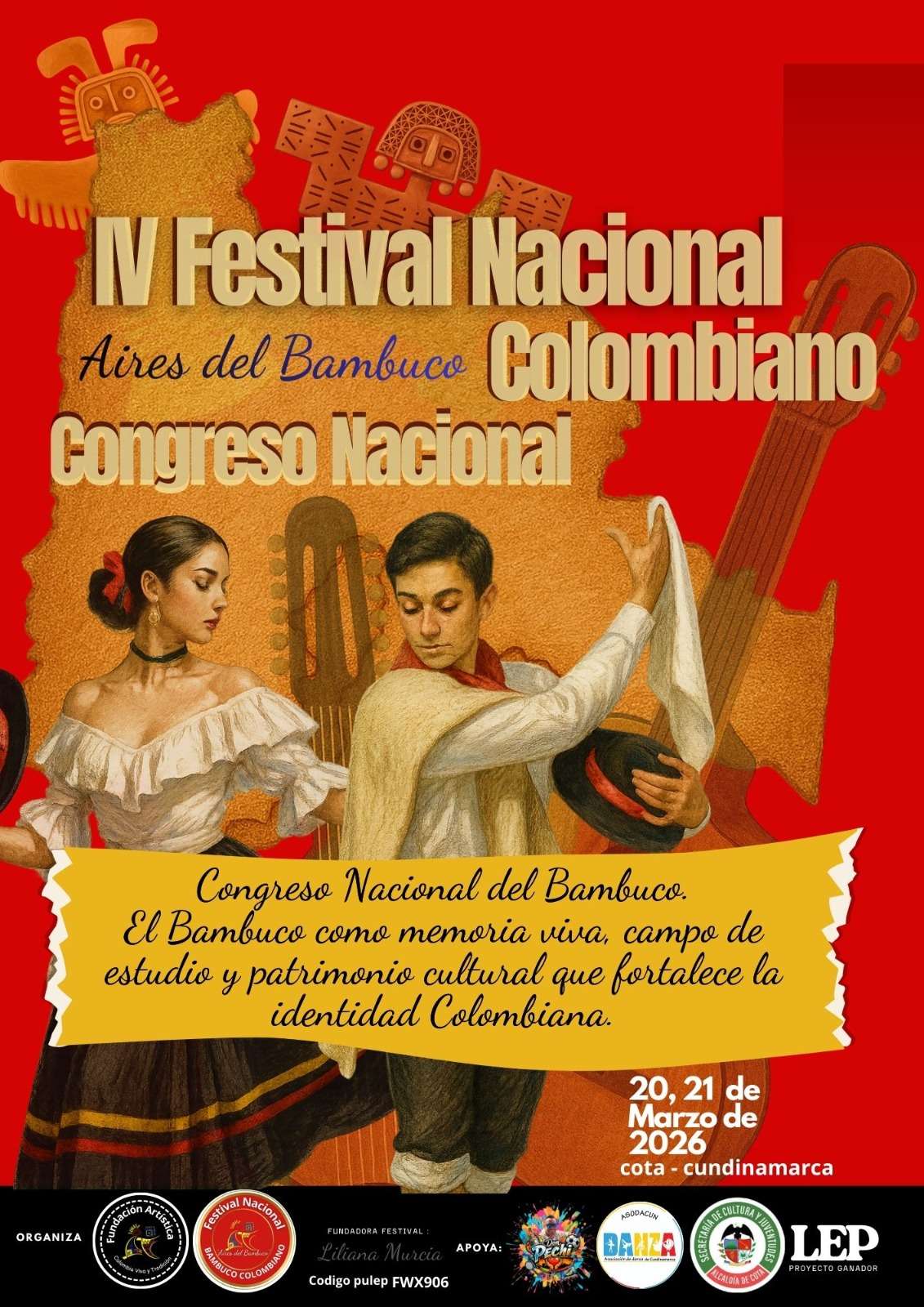 Los próximos 21 y 22 de marzo, el municipio de Cota, en Cundinamarca, será escenario del IV Festival Nacional Aires del Bambuco Colombiano – Edición Reinado Departamental del Bambuco Cundinamarqués, un evento que reúne la riqueza cultural, musical y dancística de una de las expresiones más representativas del folclor del país.